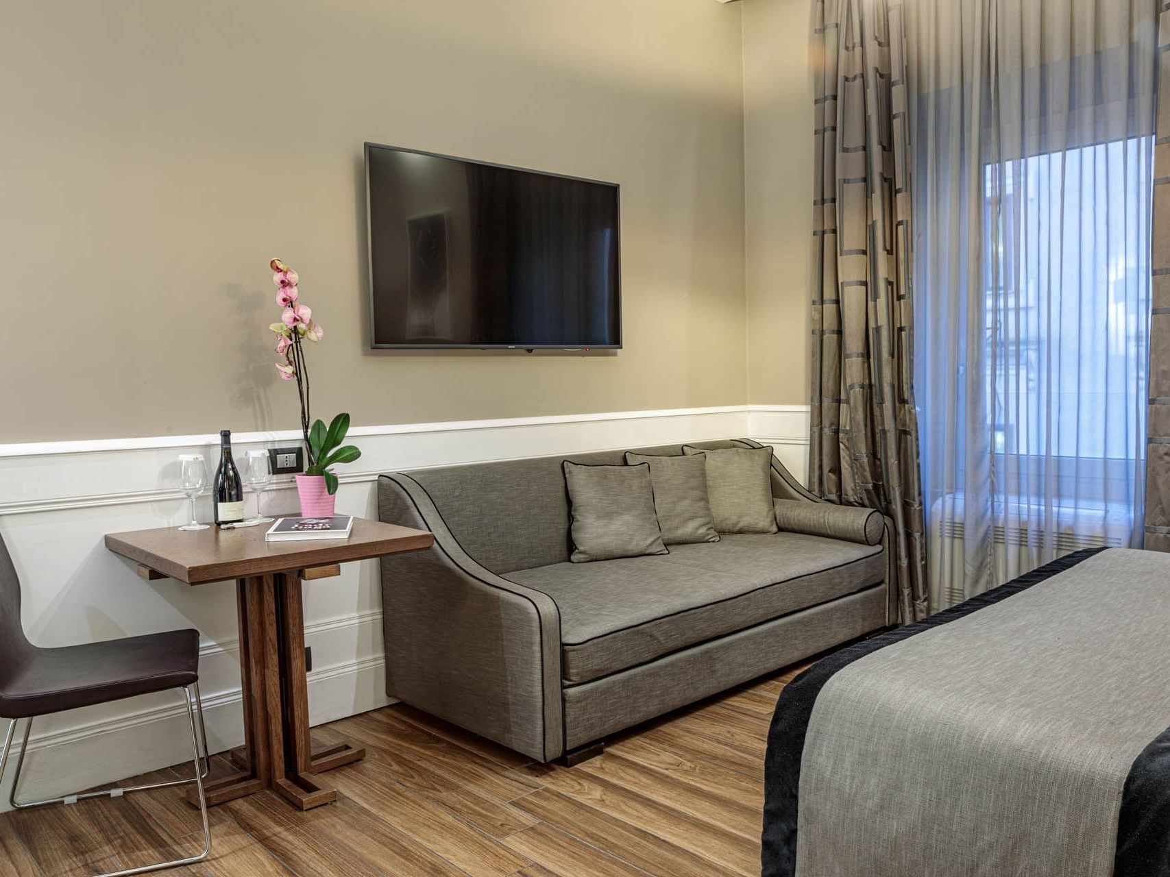 Elegant and refined, the Deluxe Room offers you 25 square meters of pure comfort. Relax on the king-size bed or on the dormeuse, surrounded by modern and cosy design. The private bathroom, with a spacious shower cabin and selected toiletries, pampers you with a touch of luxury. Soundproofed and equipped with advanced amenities, this room is ideal for those seeking relaxation and style in the heart of the city.